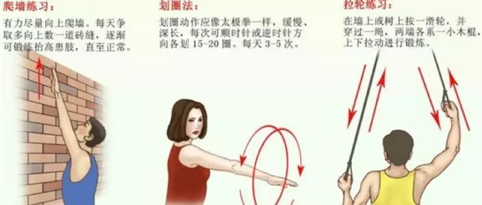 而对于肩周炎,自我锻炼应着重耸肩、“爬墙”、“刷锅”、梳头、甩手、旋肩等日常动作,它们均对肩关节活动范围的恢复起到显著的促进作用。